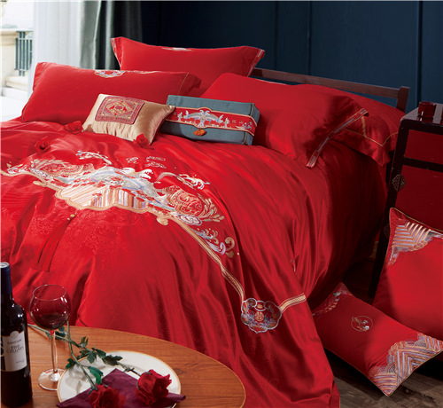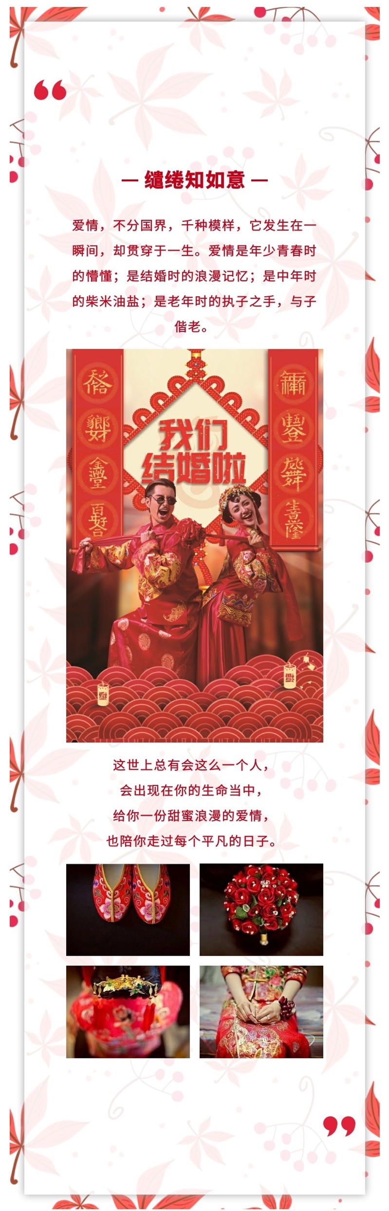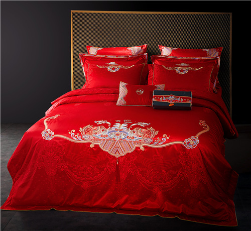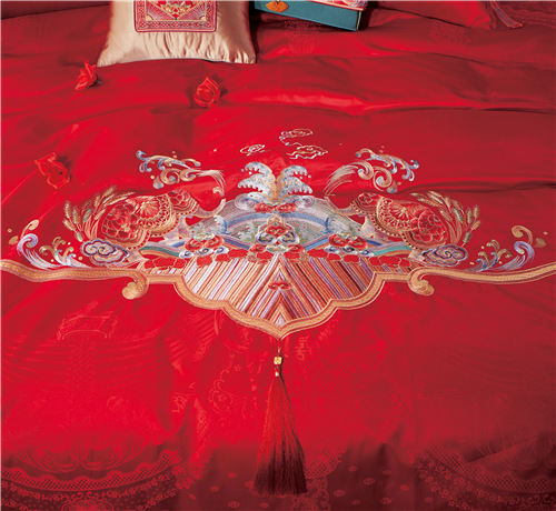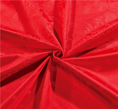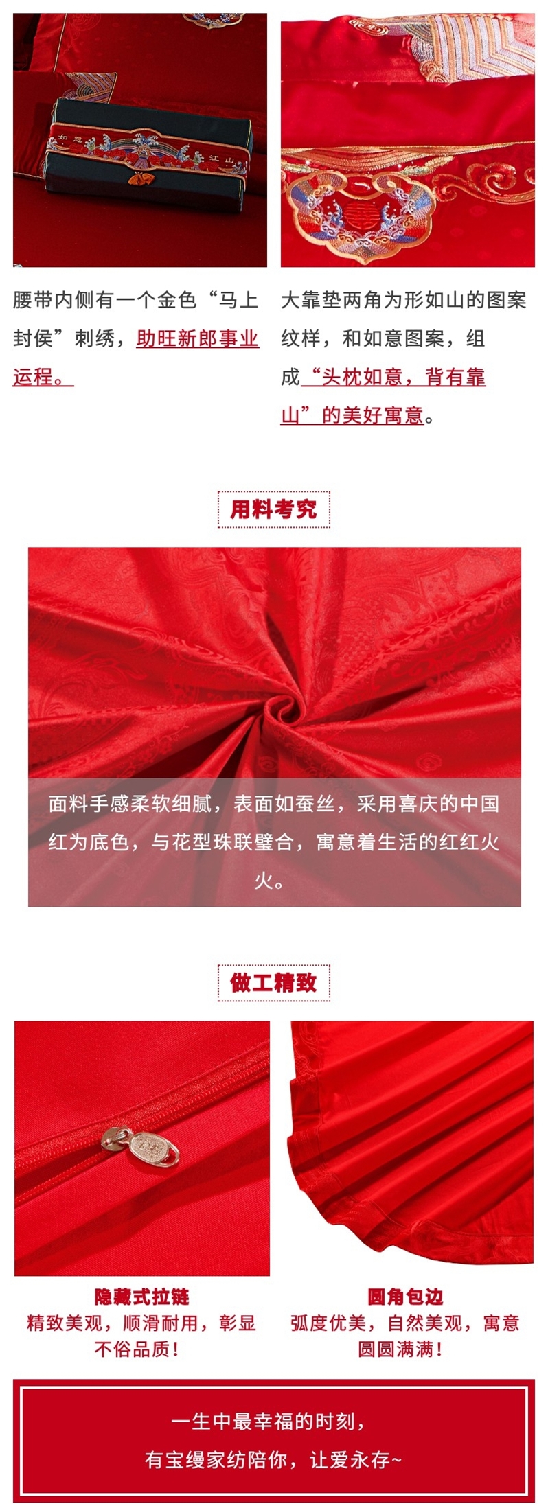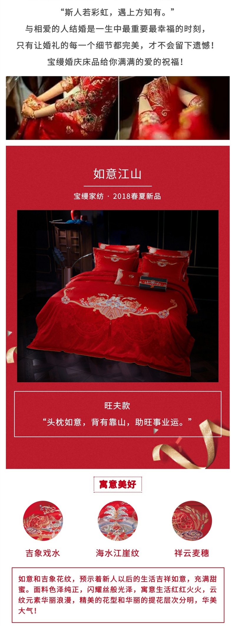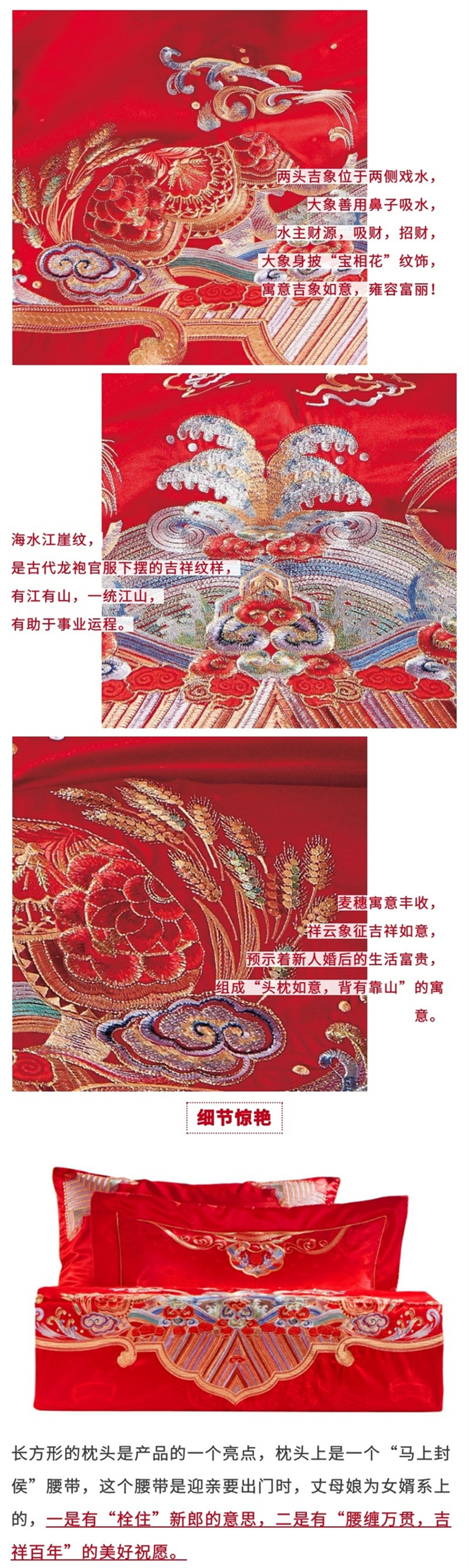 如意和吉象花紋,預示著新人以后的生活吉祥如意,充滿甜蜜。面料色澤純正,閃耀絲般光澤,寓意生活紅紅火火,云紋元素華麗浪漫,精美的花型和華麗的提花層次分明,華美大氣!