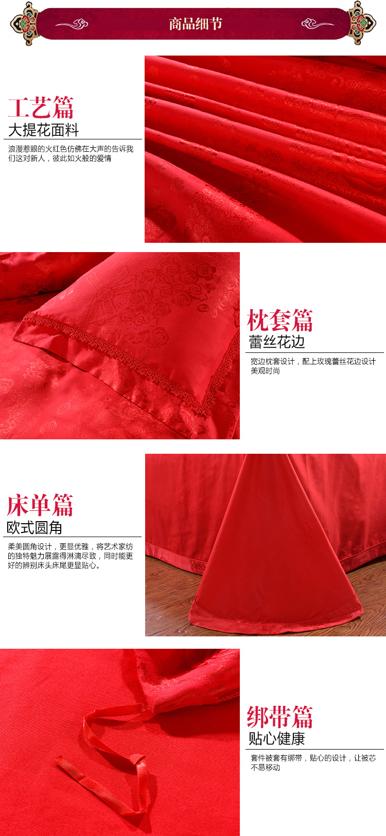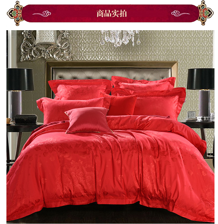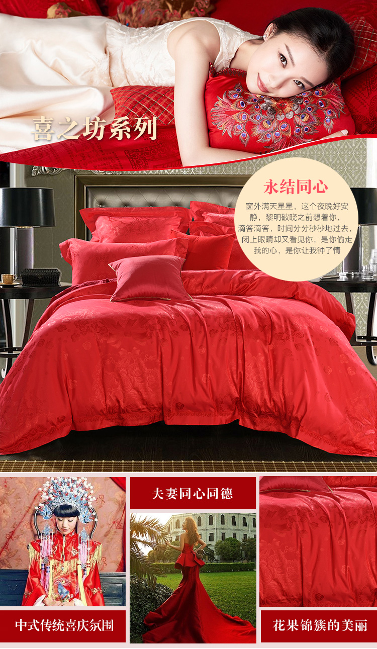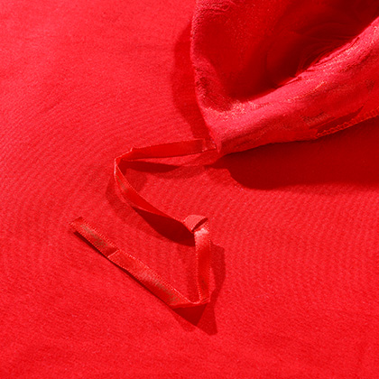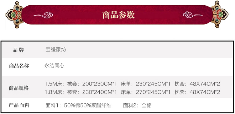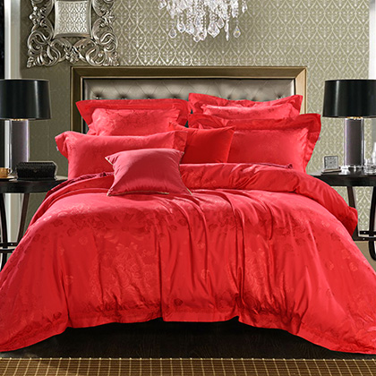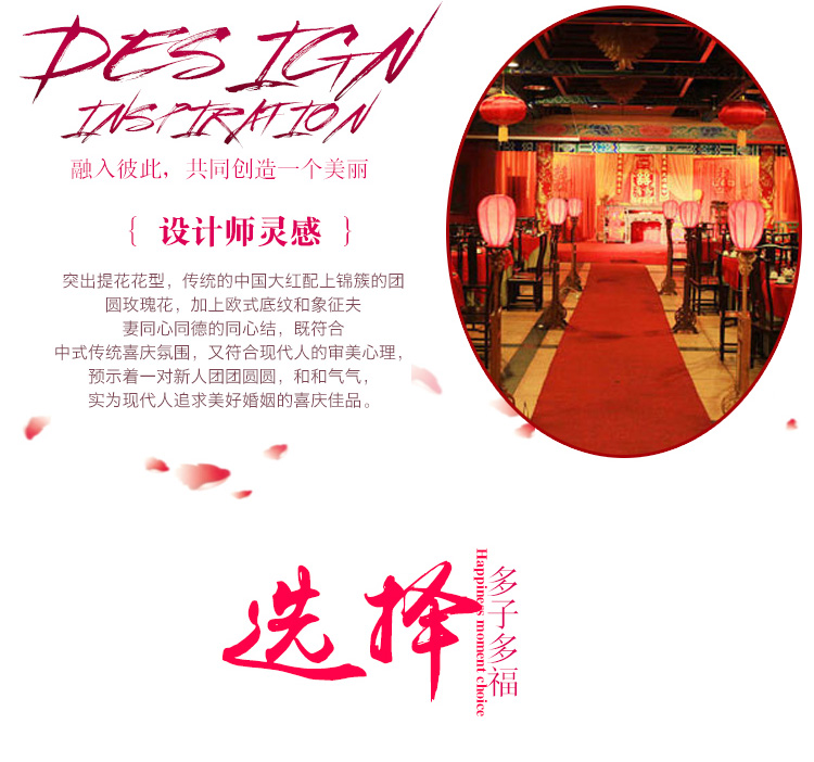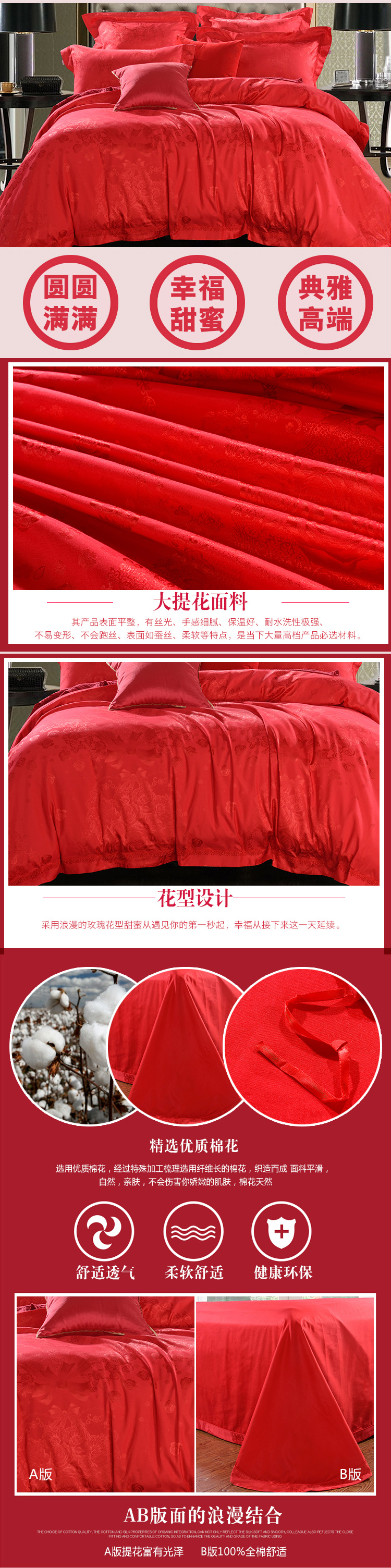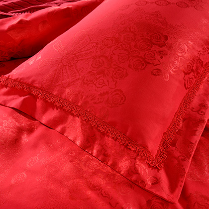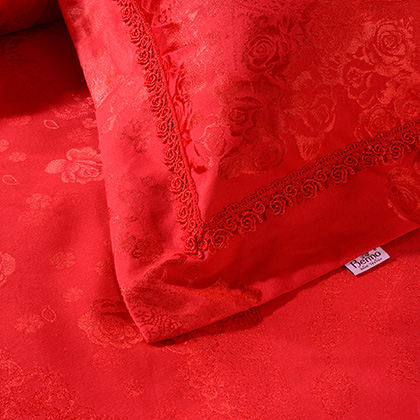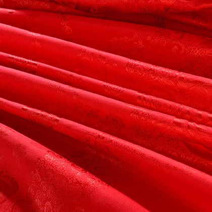 花型:突出提花花型,傳統(tǒng)的中國(guó)大紅配上錦簇的團(tuán)圓玫瑰花,加上歐式底紋和象征夫妻同心同德的同心結(jié),既符合中式傳統(tǒng)喜慶氛圍,又符合現(xiàn)代人的審美心理,預(yù)示著一對(duì)新人團(tuán)團(tuán)圓圓,和和氣氣,實(shí)為現(xiàn)代人追求美好婚姻的喜慶佳品。