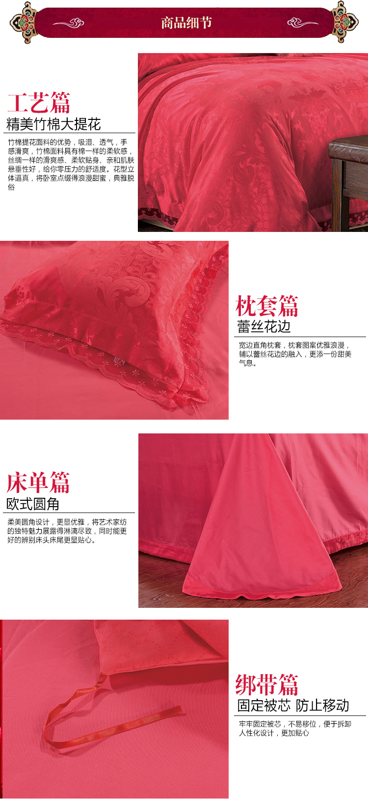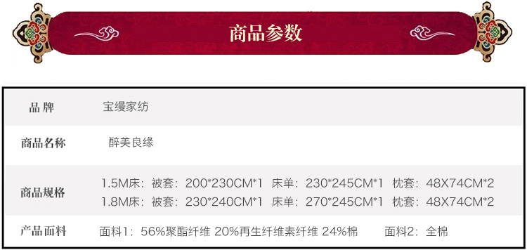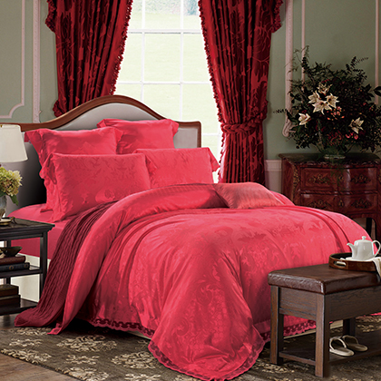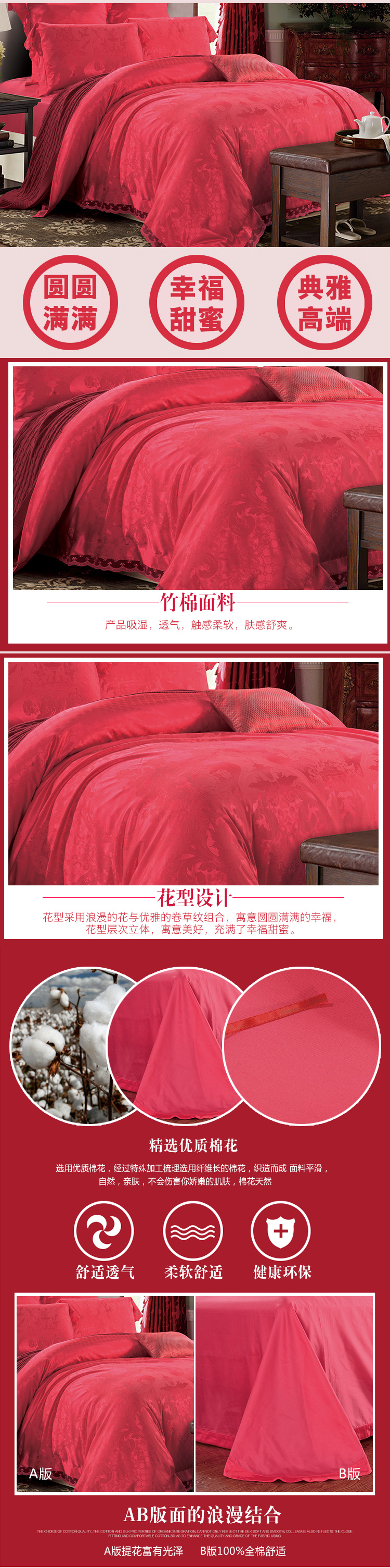 面料:此款產品采用高織高密竹棉提花,質地柔軟,顏色艷麗,具有布面條干均勻、紋路清晰、平整光潔、光滑似綢的風格,產品用著舒適,并具有良好的抗菌性能。