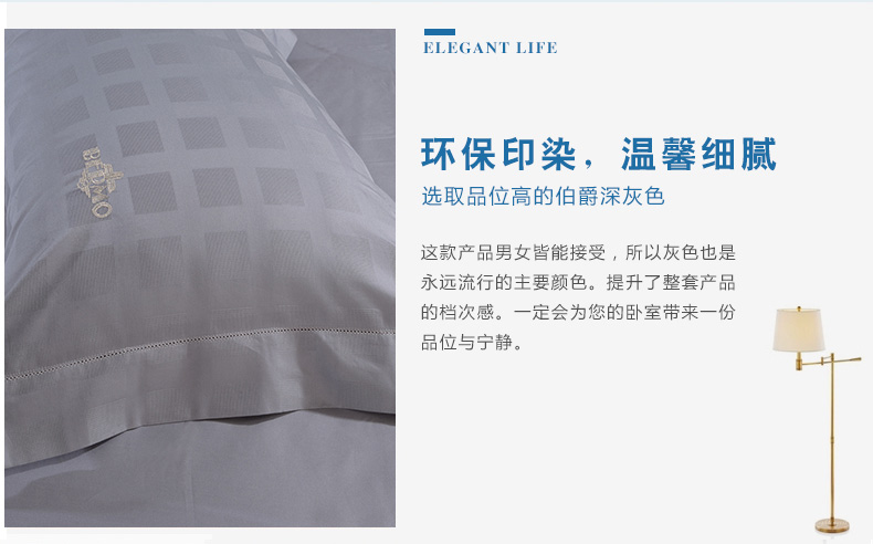 這款產(chǎn)品的顏色選取品位極高的伯爵深灰色。灰色 Gray具有柔和,高雅的意象,象征誠(chéng)懇、沉穩(wěn)、考究。而且屬于中間性格,男女皆能接受,所以灰色也是永遠(yuǎn)流行的主要顏色。它不但提升了整套產(chǎn)品的檔次感。還為您的臥室?guī)硪环萜肺慌c寧?kù)o。