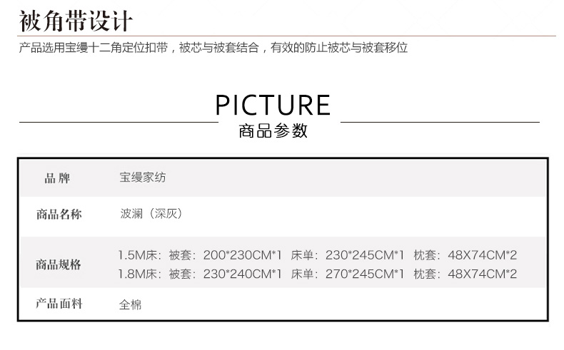 第四:產(chǎn)品選用寶縵十二角定位扣帶,被芯與被套完美結(jié)合,有效的防止被芯與被套移位,晚上休息您就不用擔(dān)心的被芯會(huì)跑來跑去,您可以很快的進(jìn)入夢(mèng)鄉(xiāng)了。