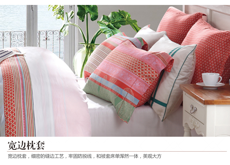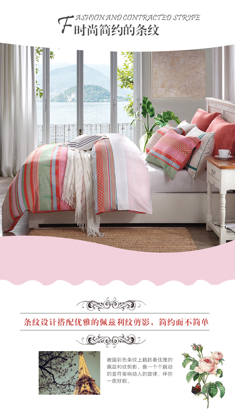 工藝:床單上簡潔的小花清新時尚,彩條紋與簡約小花碰撞出年輕時尚的火花,營造出一個活力時尚的居家氛圍。