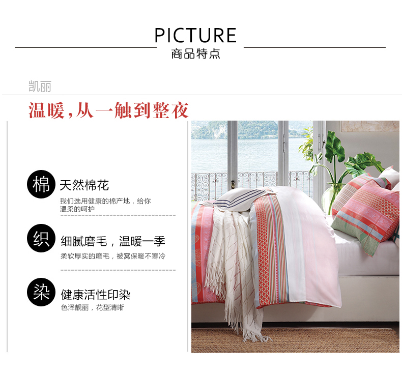 寶縵家紡,精彩推薦!今天為大家推薦的是寶縵2016年秋冬新品“凱麗”,產品采用全棉磨毛面料,織物表面絨毛更細、更密、更勻,手感細膩,滑爽,舒適。