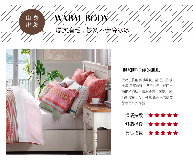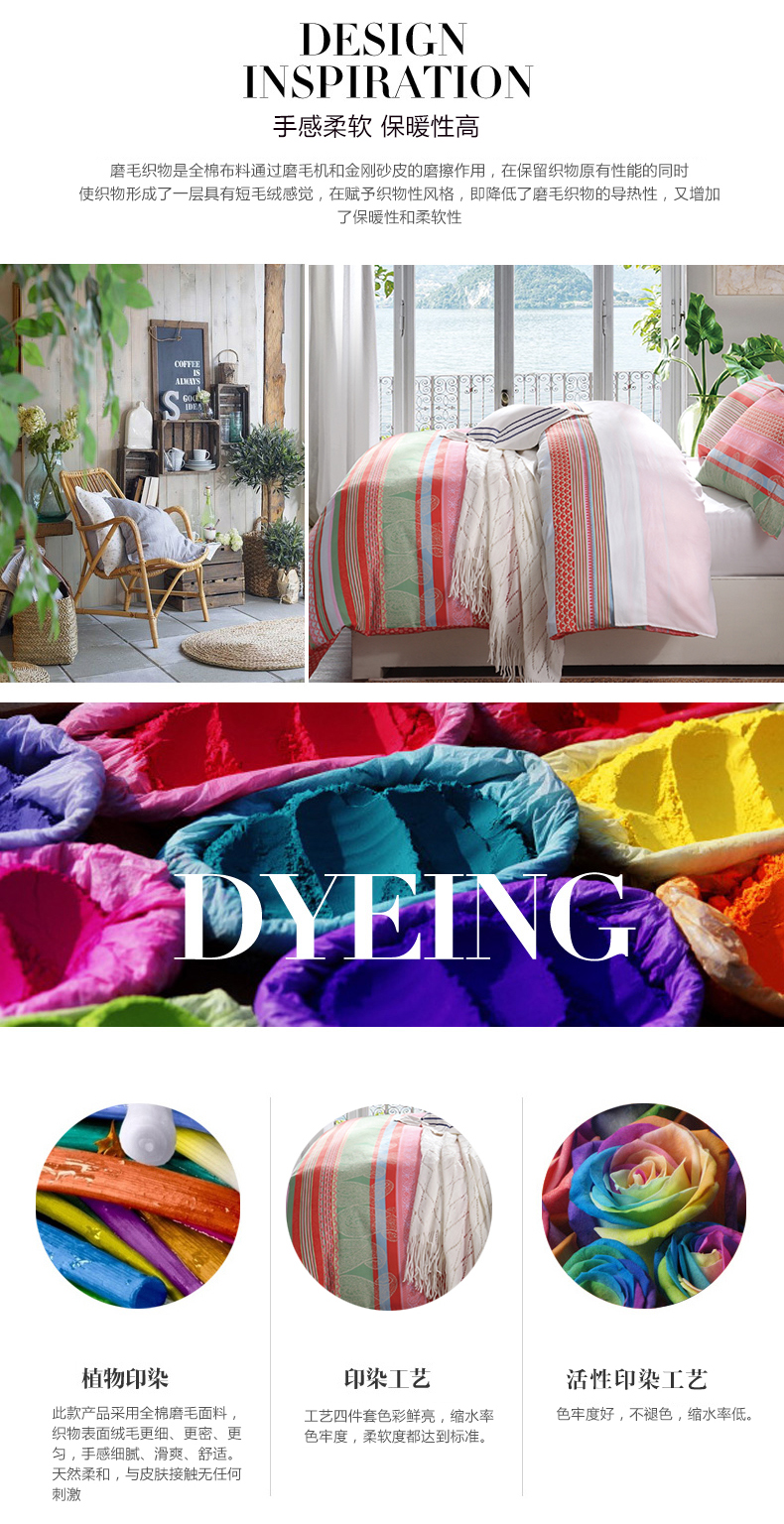 第一:磨毛產品屬于一種功能性產品,是印染的一個后整理,磨毛床品冬天使用柔軟、溫暖、舒適。