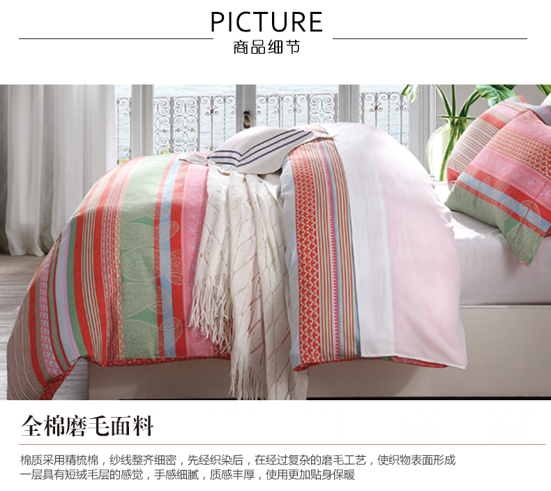 面料:此款產品采用全棉磨毛面料,織物表面絨毛更細、更密、更勻,手感細膩、滑爽、舒適。天然柔和,與皮膚接觸無任何刺激,無異味、無污染、無漂染,無任何添加物,清新自然,是健康、環保的綠色產品。