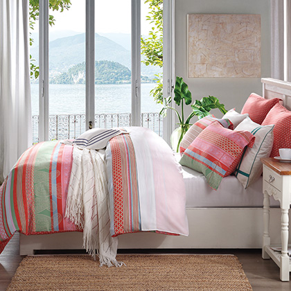 花型:被面彩色條紋上跳躍著優雅的佩茲利紋剪影,像一個個跳動的音符奏響動人的旋律,伴你一夜好眠。