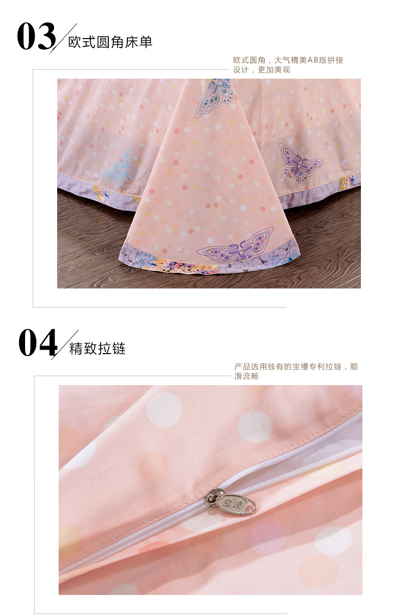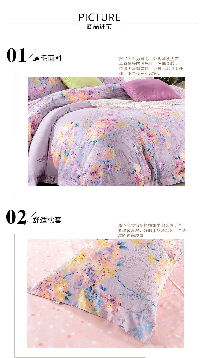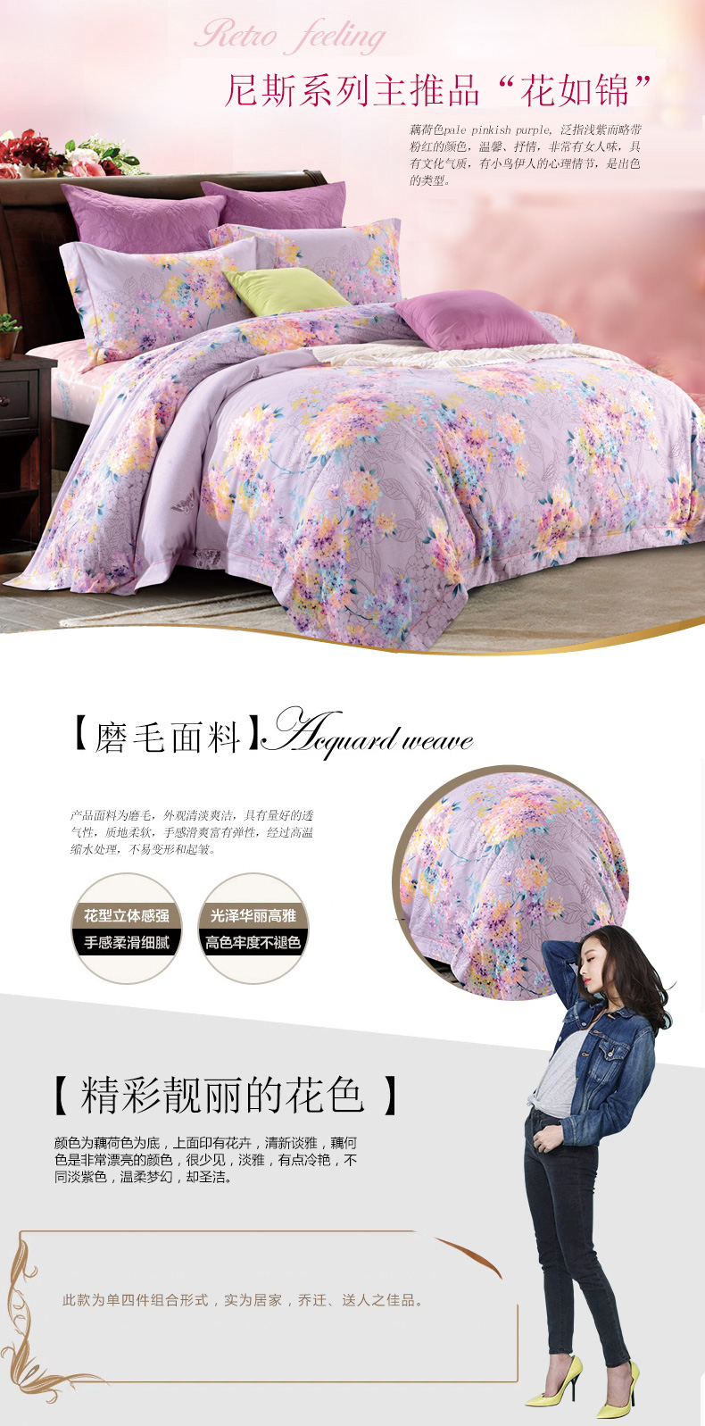 面料:產(chǎn)品面料為磨毛,外觀清淡爽潔,具有量好的透氣性,質(zhì)地柔軟,手感滑爽富有彈性,經(jīng)過(guò)高溫縮水處理,不易變形和起皺。
