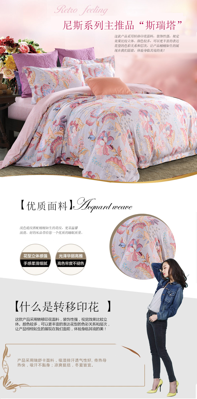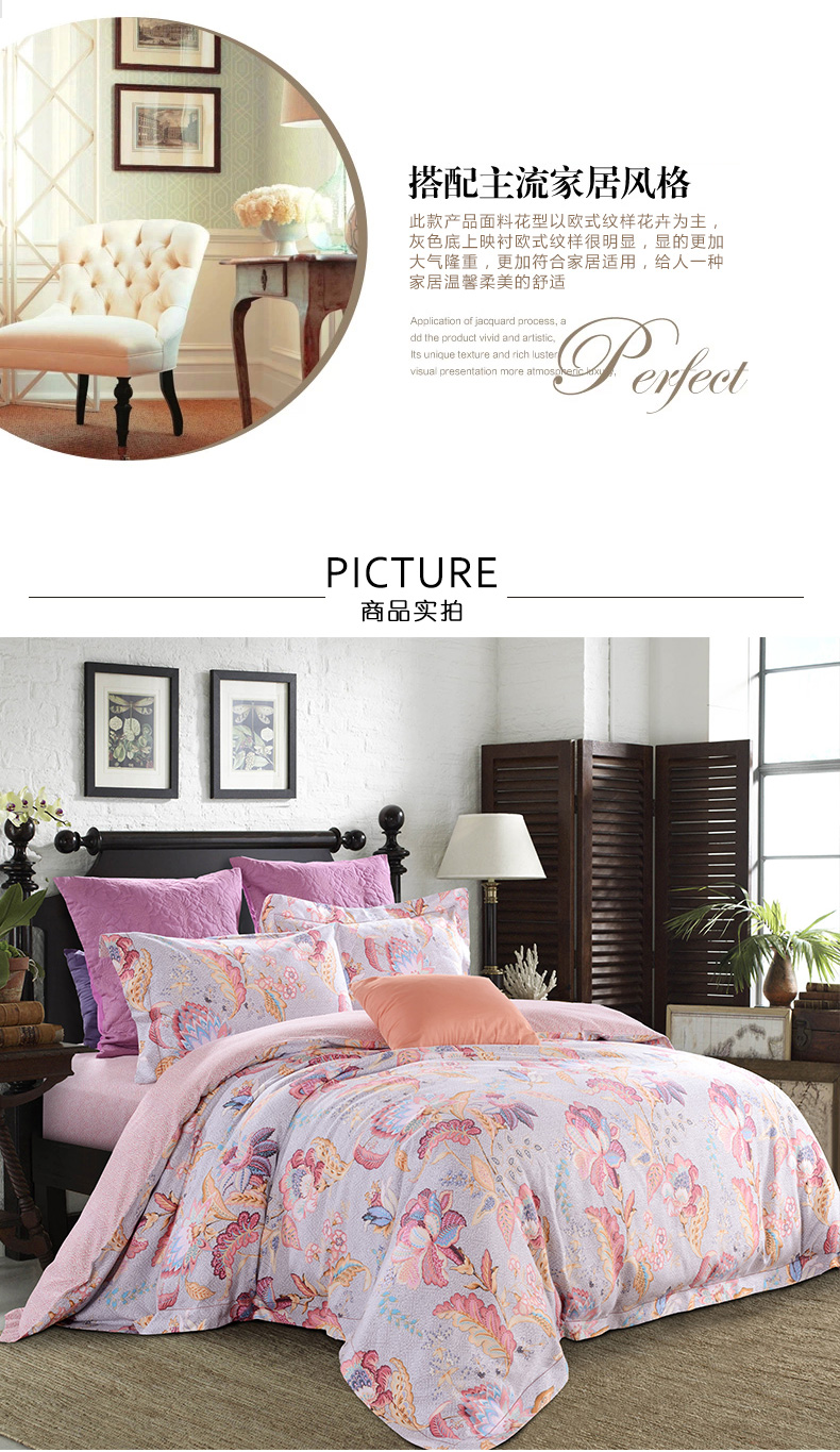 花型:產品以歐式紋樣花卉為主,灰色底上映襯歐式紋樣很明顯,顯的更加大氣隆重,更加符合家居適用,給人一種家居溫馨柔美的舒適。