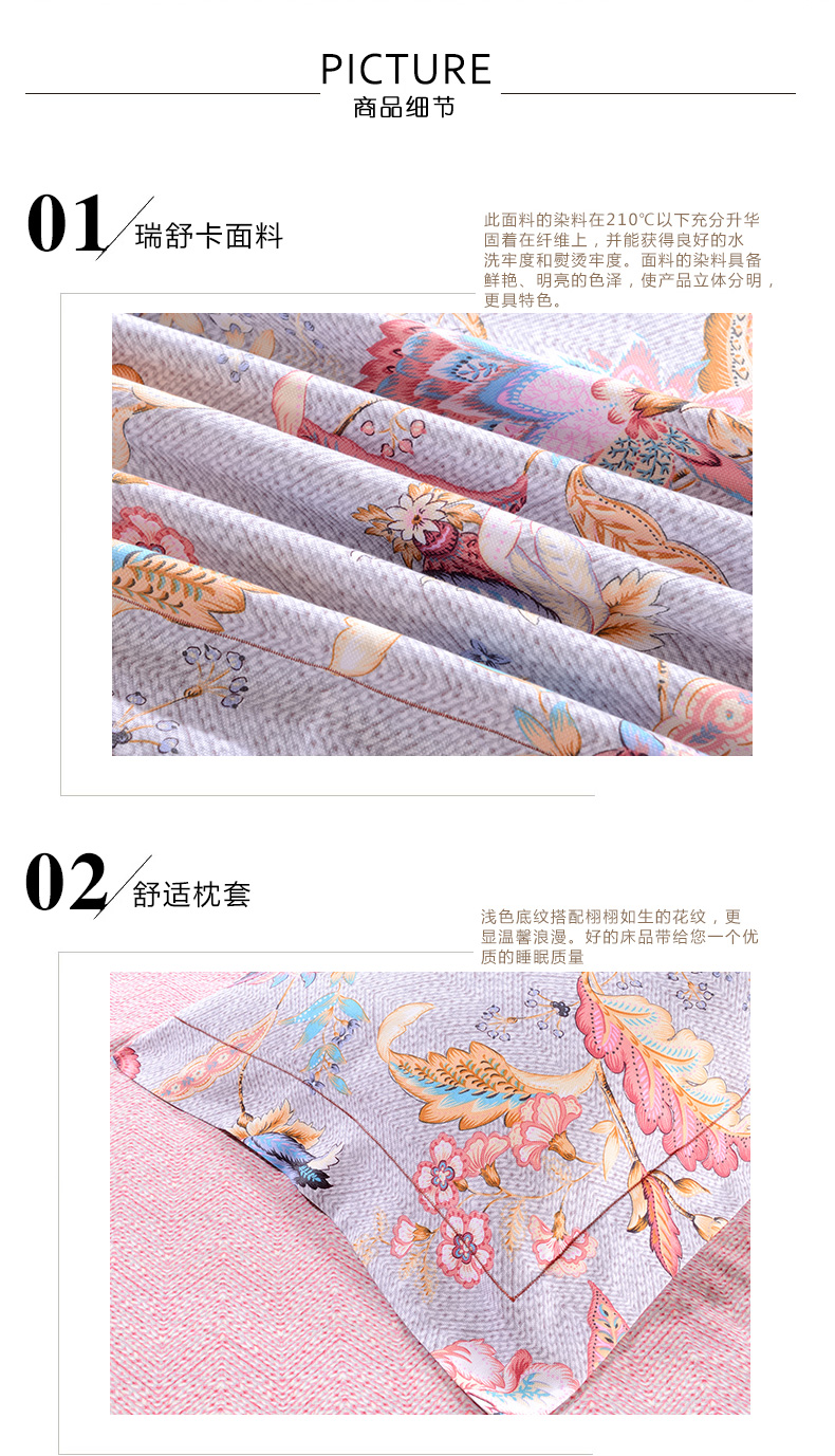 面料:產品采用瑞舒卡面料,保暖性好,質地輕,強力大,防蟲防霉,靜電少,織物不污染,不起球。