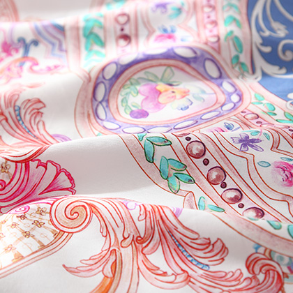 設計創意:燦爛的花卉與巴洛克卷草紋樣交相輝映,映襯著文藝復興時期雍容華貴的藝術氣息。