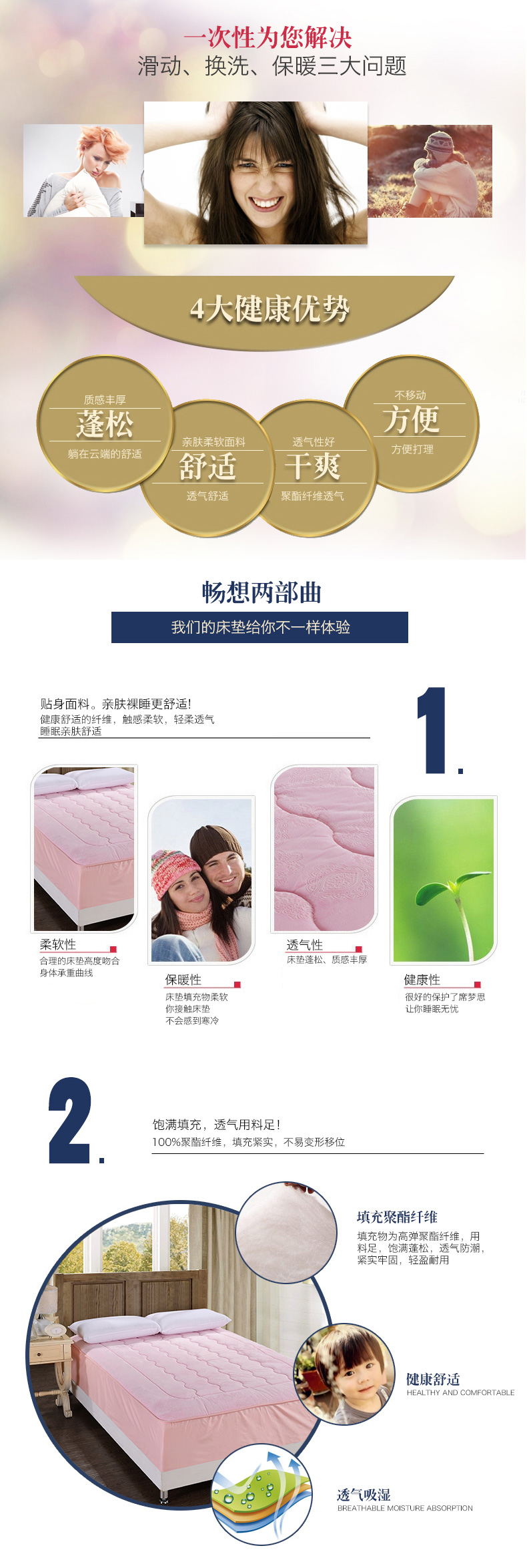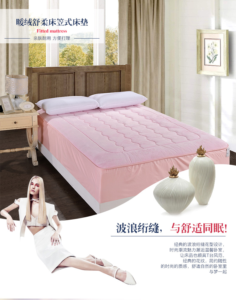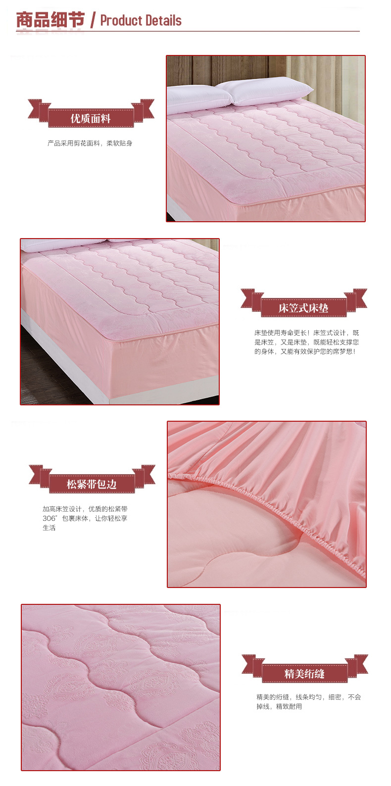 工藝:精心設計的絎縫花型,簡約,美觀,填充物不再滑動,床墊使用壽命更長!床笠式設計,既是床笠,又是床墊,既能輕松支撐您的身體,又能有效保護您的席夢思!