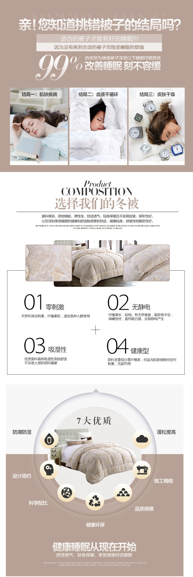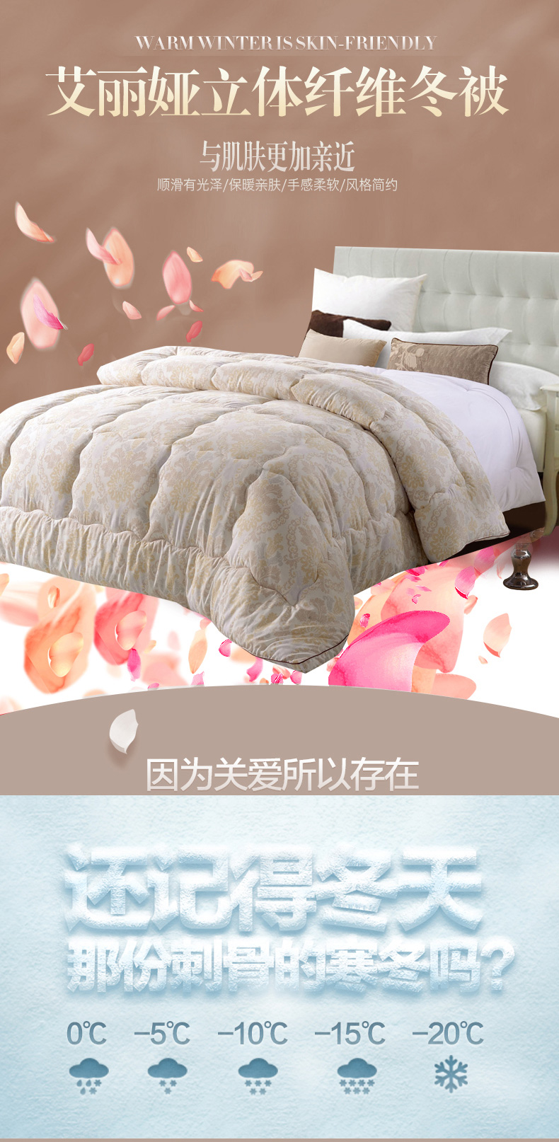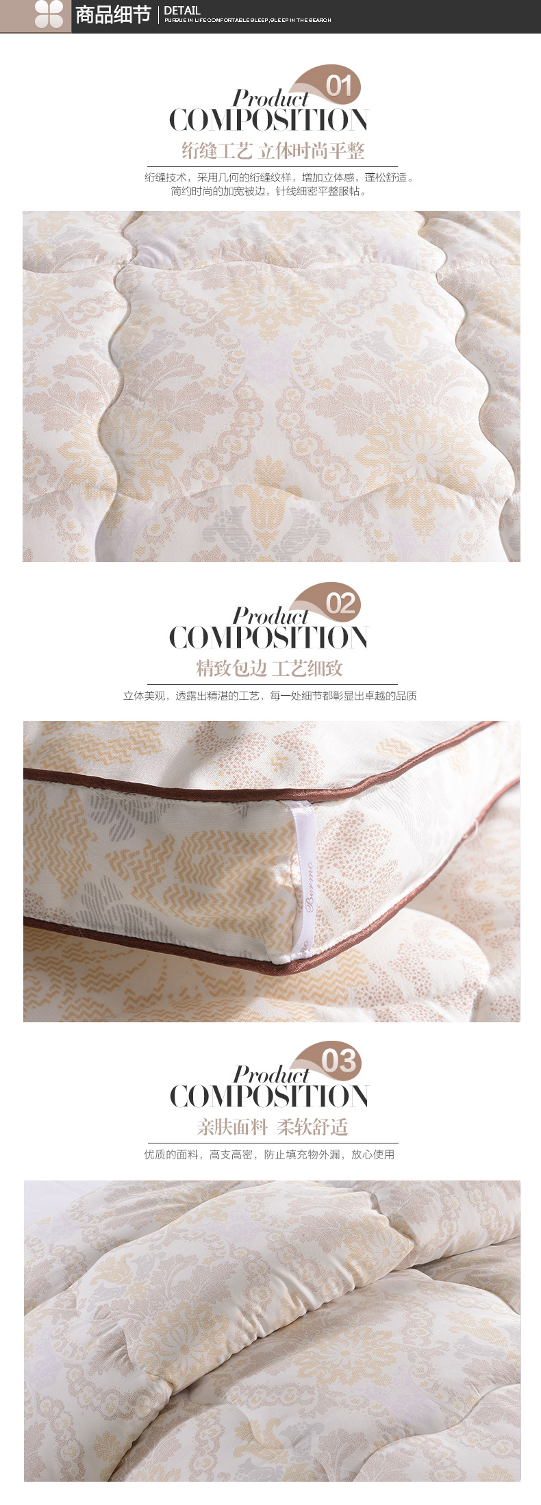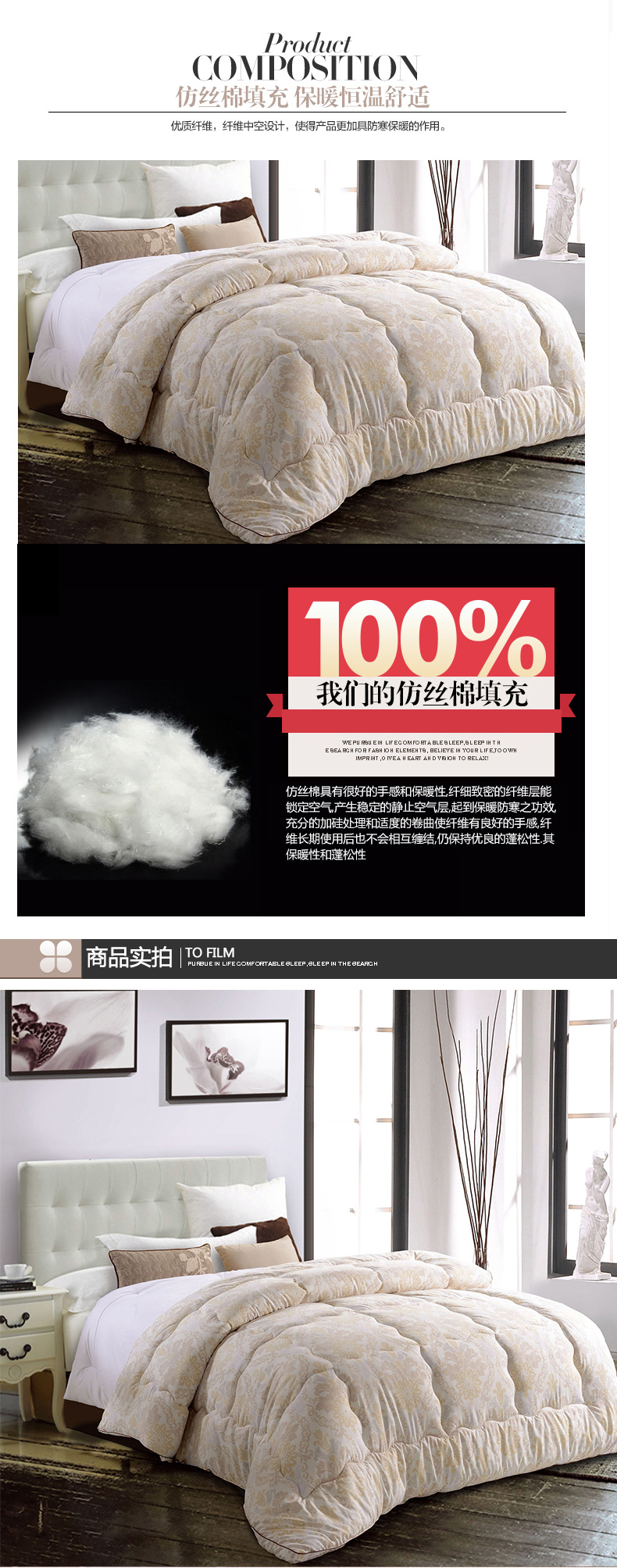 產品特點:精選優質磨毛親膚面料,輕盈保暖,超細羽絲絨填充,使被芯具有良好的保暖性。