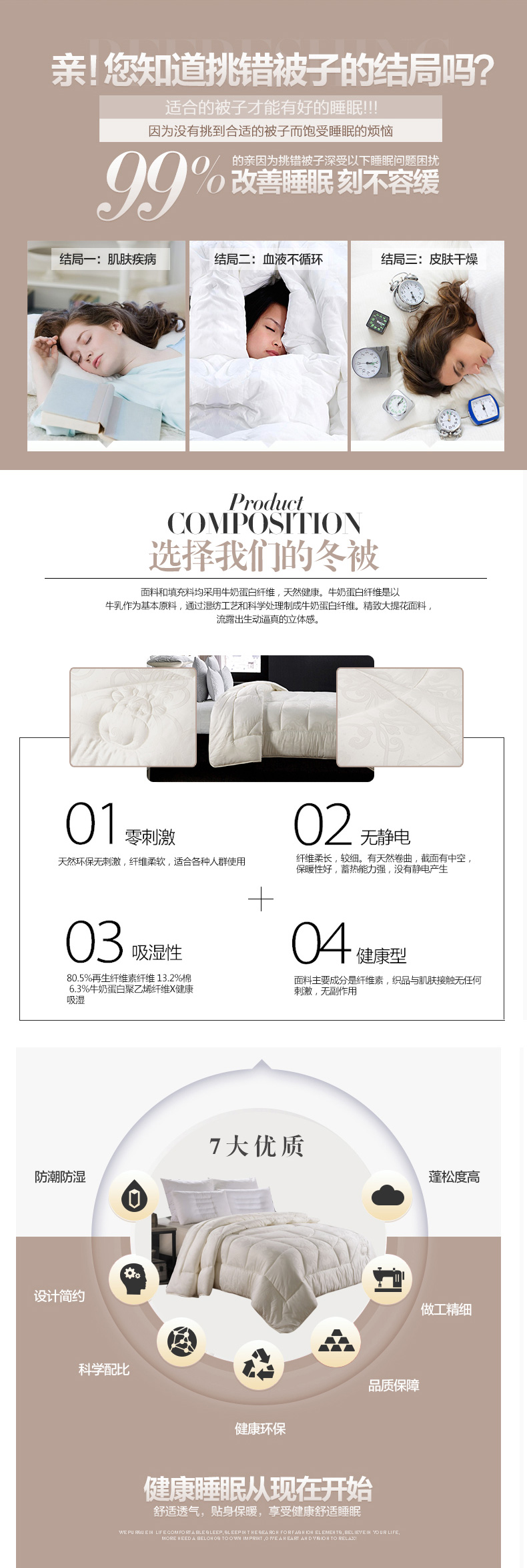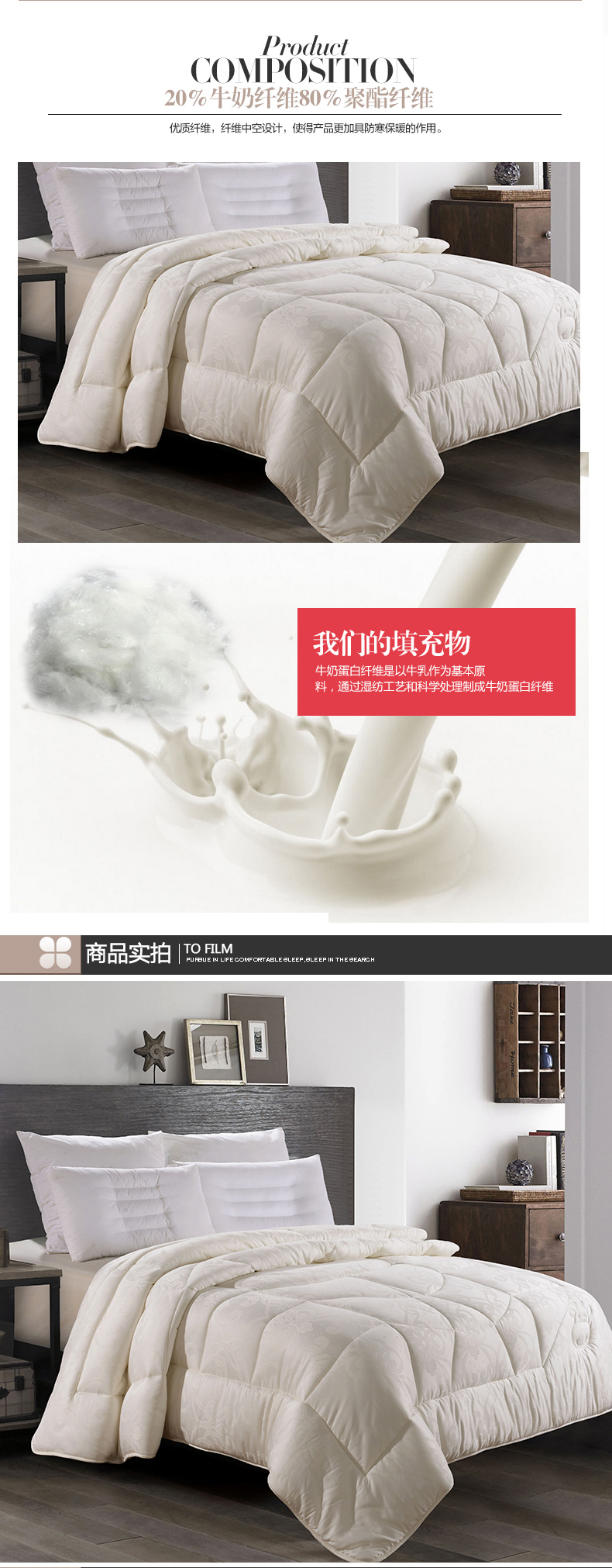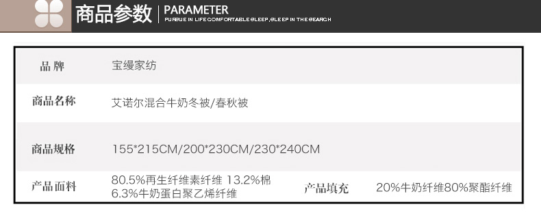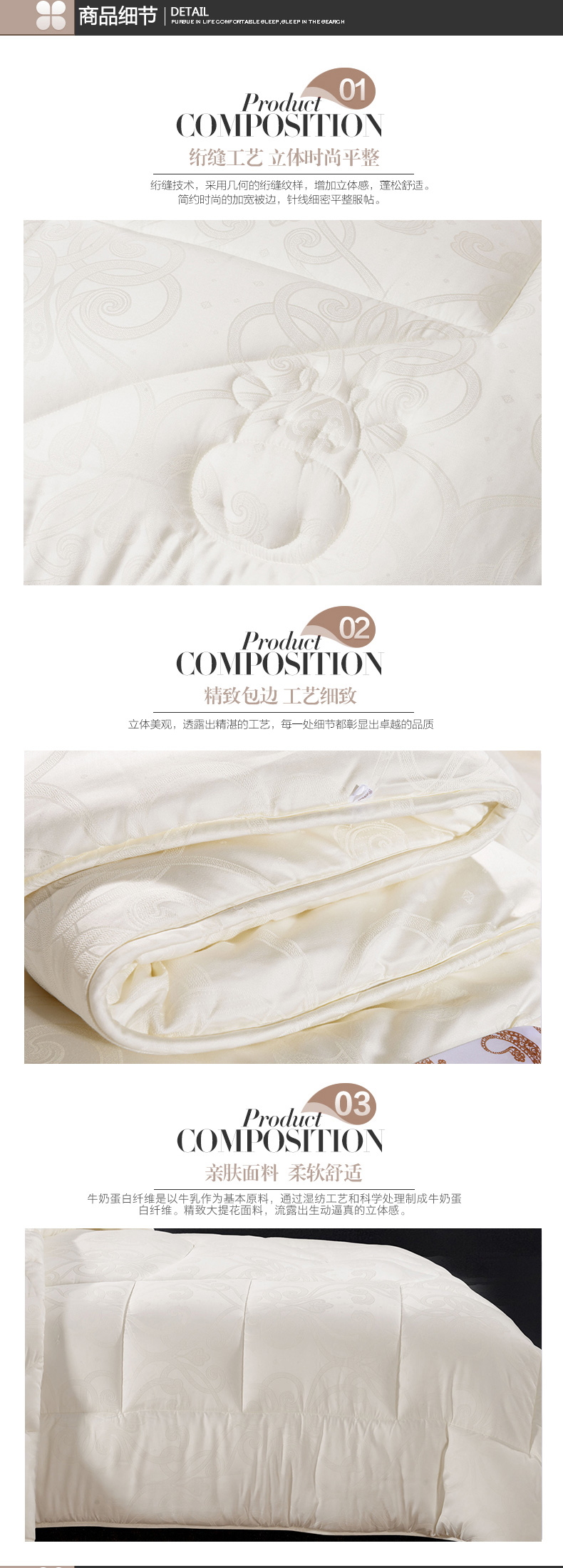 產品特性:面料和填充料均采用具有氨基酸的牛奶蛋白纖維,天然健康。牛奶蛋白纖維是以牛乳作為基本原料,通過濕紡工藝和科學處理制成牛奶蛋白纖維。精致大提花面料,流露出生動逼真的立體感。