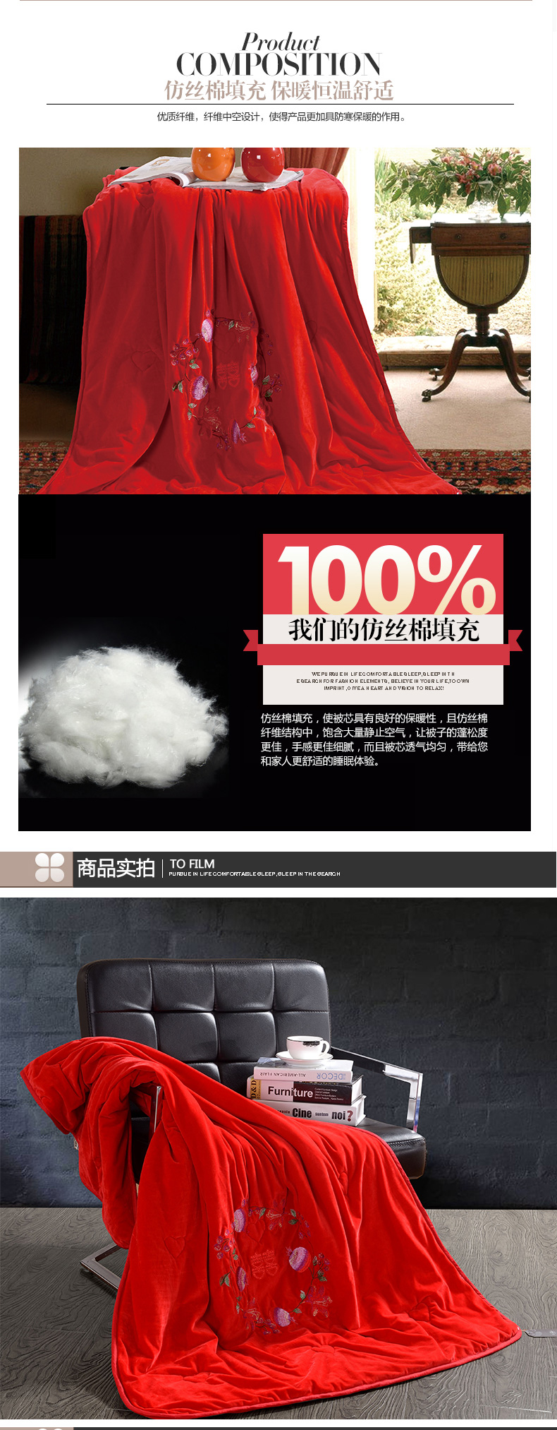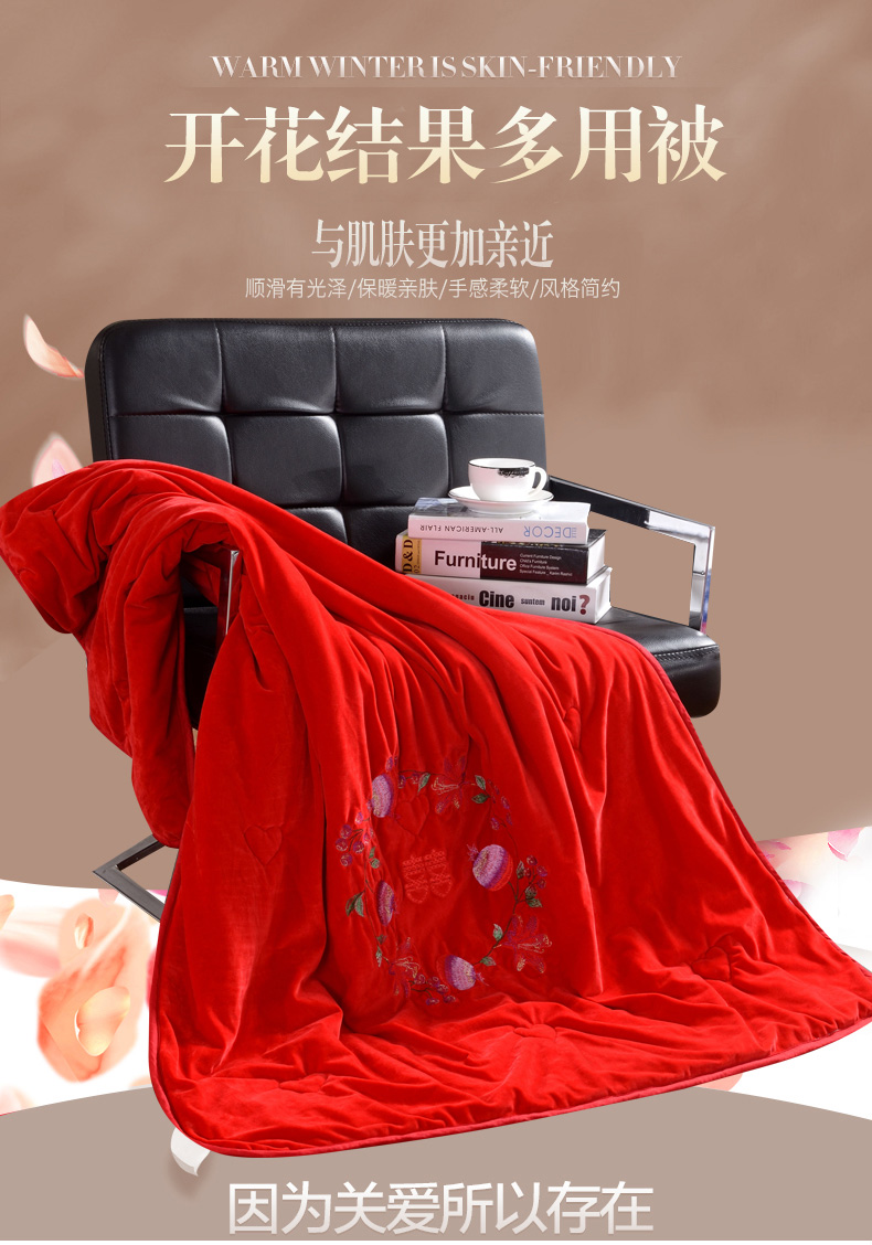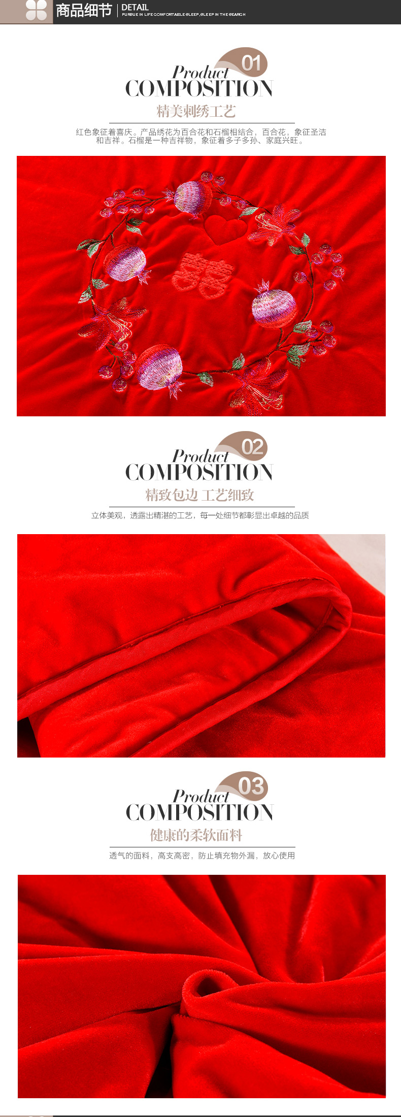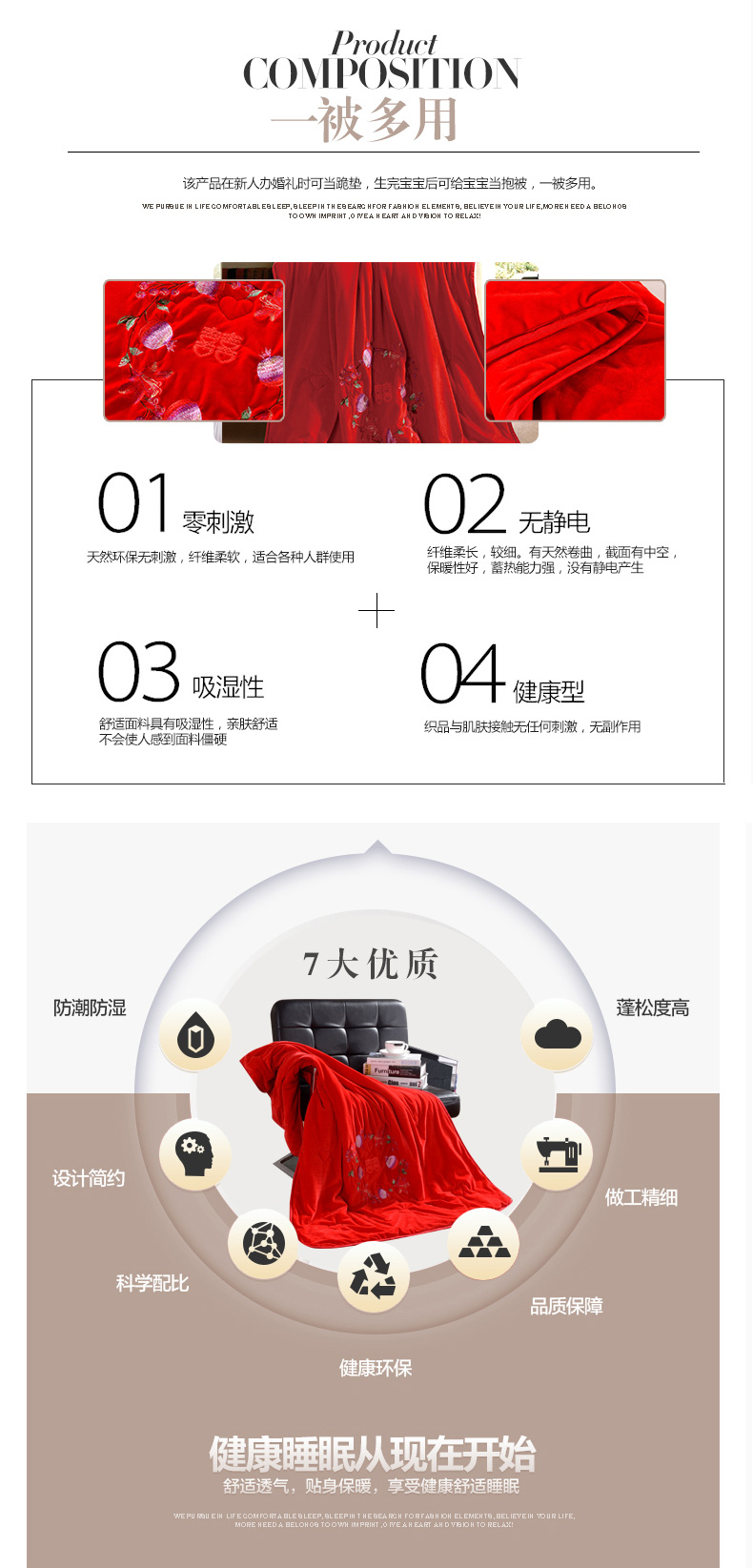 工藝:該產品在新人辦婚禮時可當跪墊,生完寶寶后可給寶寶當抱被,一被多用。
