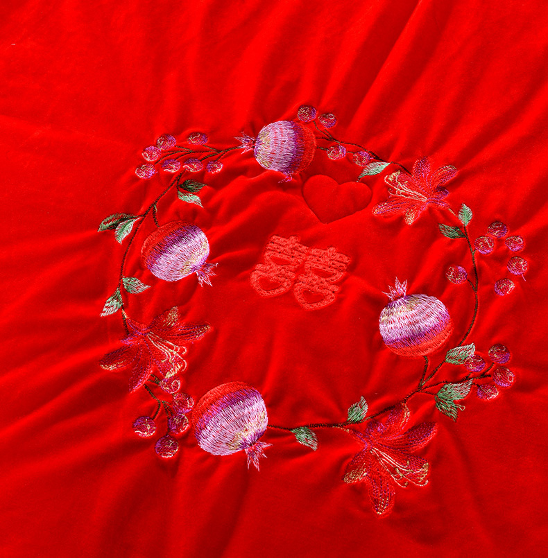 產品特點:紅色象征著喜慶。產品繡花為百合花和石榴相結合,百合花,象征圣潔和吉祥。石榴是一種吉祥物,象征著多子多孫、家庭興旺。