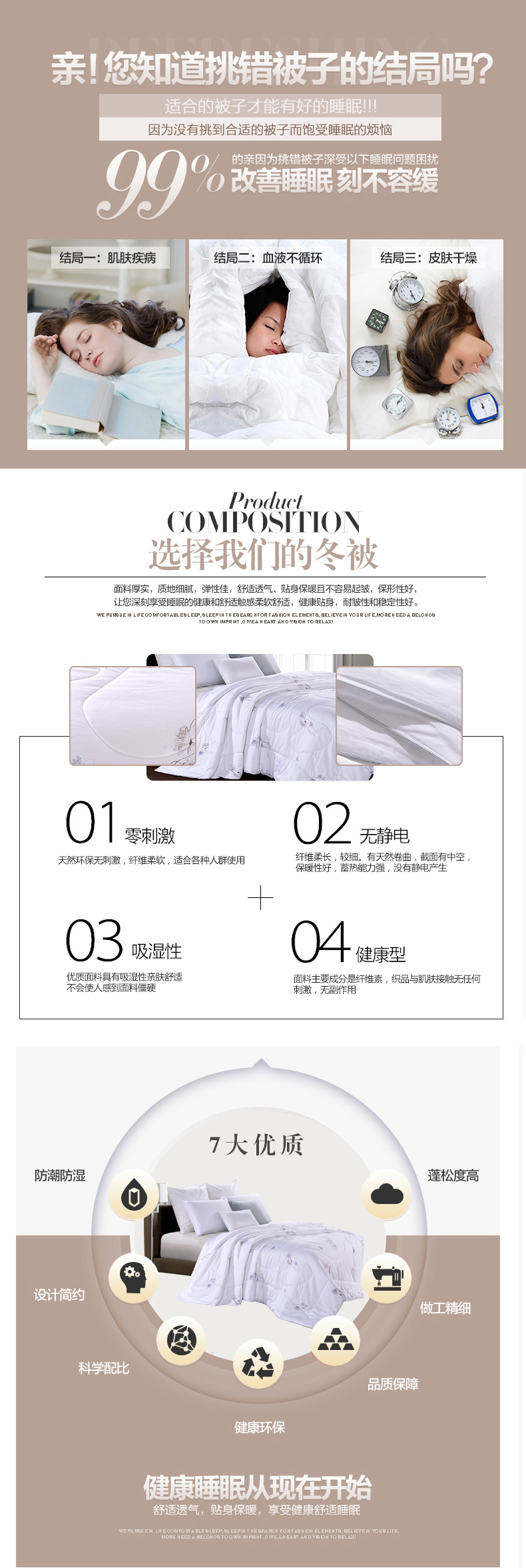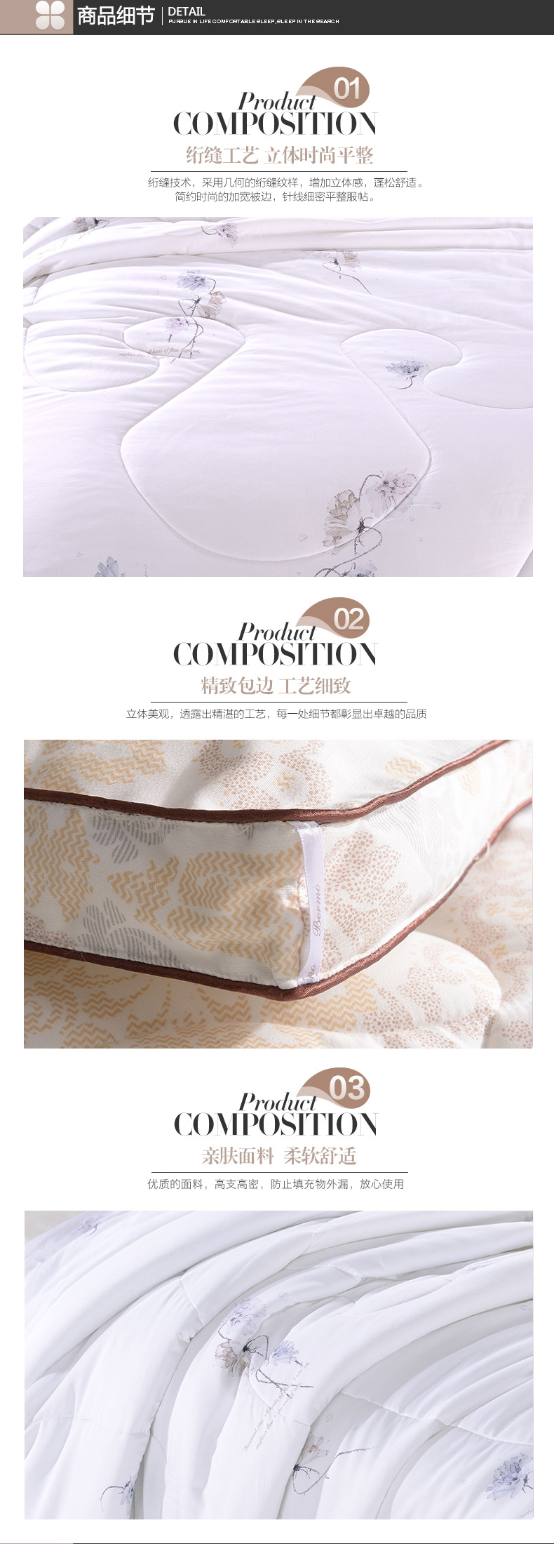 工藝:精美的絎縫技術,固定內芯,形成固定蓬松點,使得內部填充更加蓬松。四周筋條固邊,固定更精密。