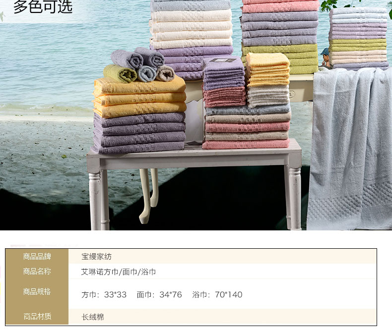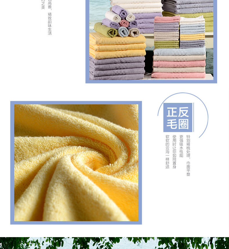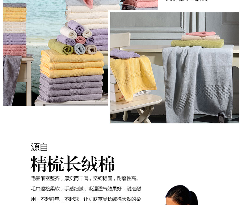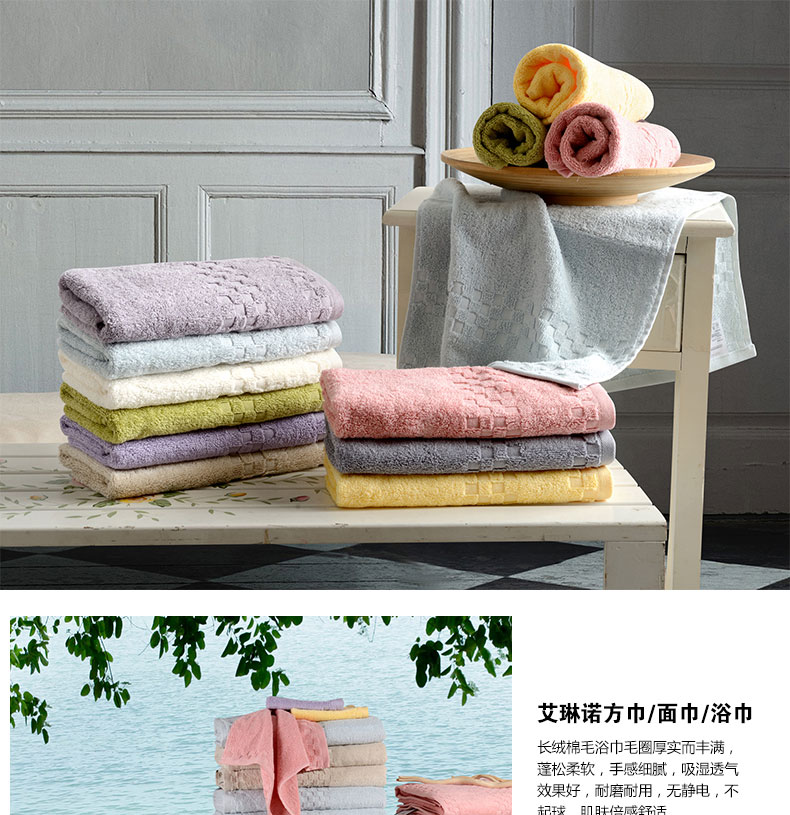 毛圈細密整齊,厚實而豐滿,堅韌穩固,耐磨性高。毛巾蓬松柔軟,手感細膩,吸濕透氣效果好,耐磨耐用,不起靜電,不起球,讓肌膚享受長絨棉天然的柔軟度,拒絕滑膩,倍感舒適。