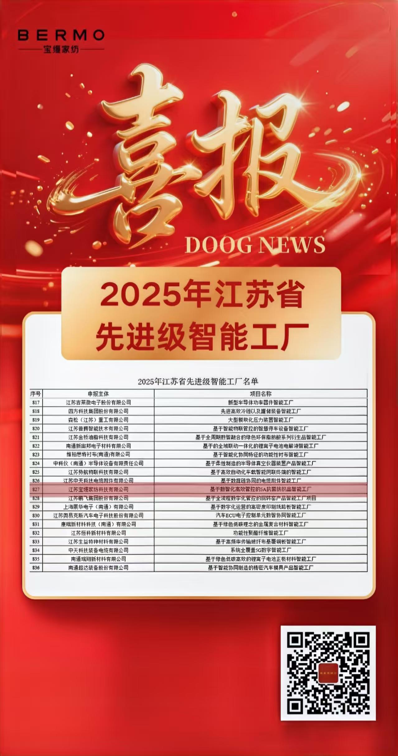 熱烈祝賀寶縵家紡榮獲“2025年江蘇省先進級智能工廠”稱號